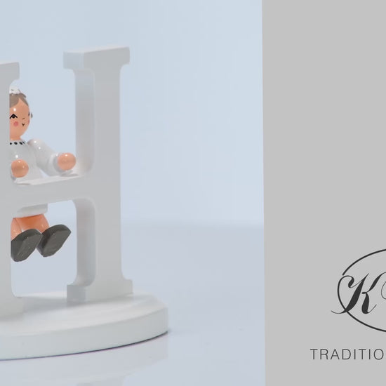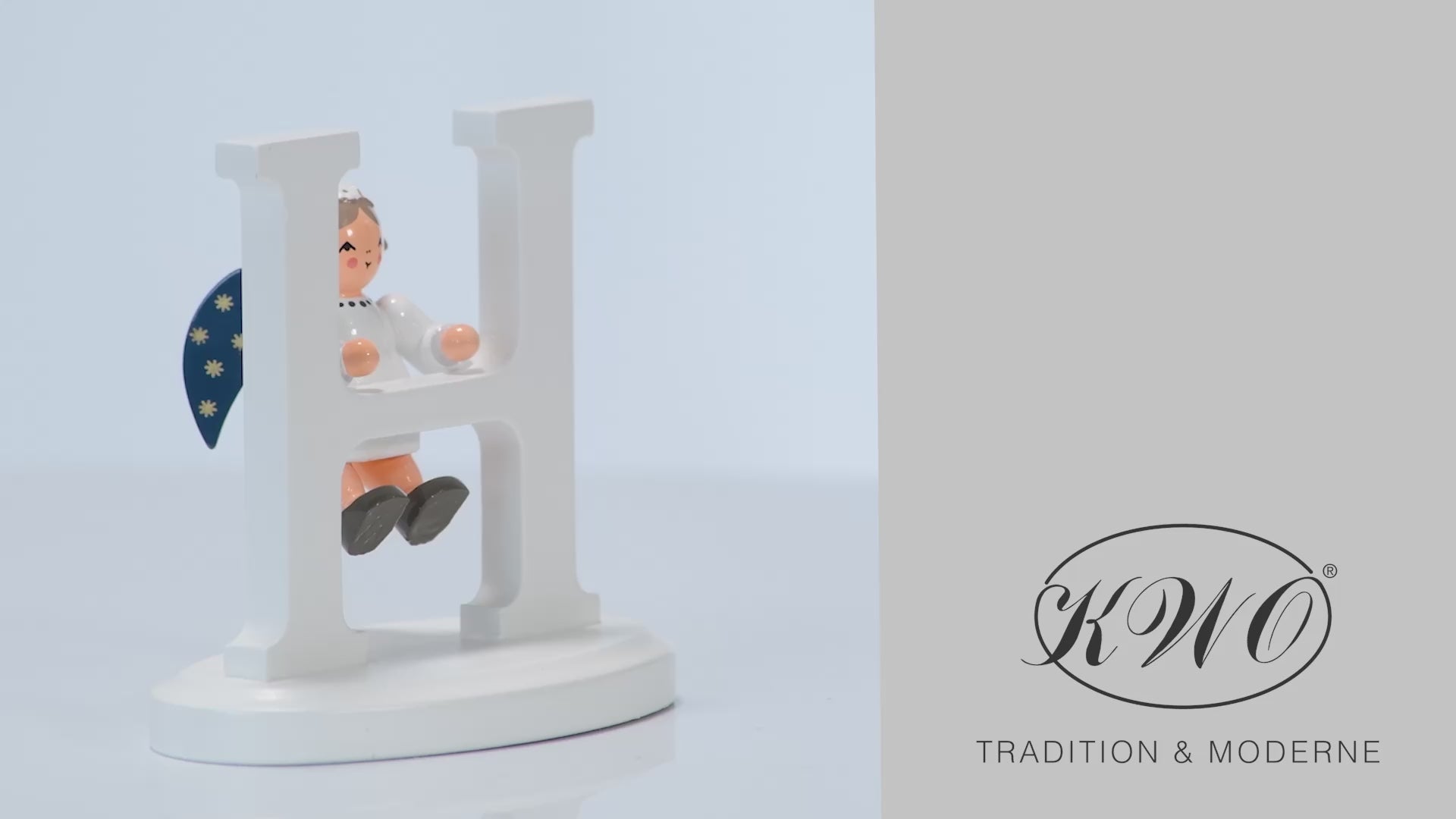 Der KWO Buchstabenengel "H" (Art. 75767) trägt ein weißes Gewand, die Flügel sind dunkelblau und mit 5 goldenen Sternchen bemalt. Der Buchstabenengel "H" wird in traditioneller Handwerkskunst im Erzgebirge mit viel Liebe zum Detail von Hand gefertigt.