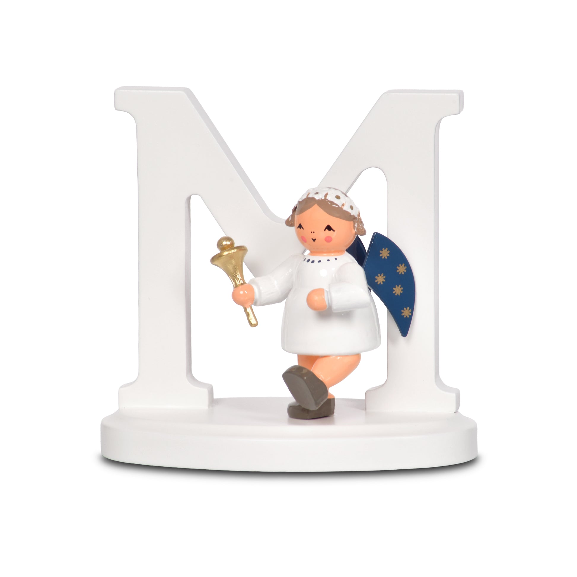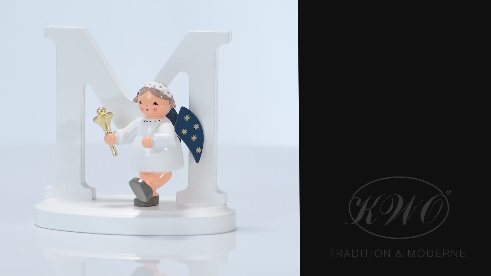 Der KWO Buchstabenengel "M" (Art. 75772) trägt ein weißes Gewand, die Flügel sind dunkelblau und mit 5 goldenen Sternchen bemalt. Der Buchstabenengel "M" wird in traditioneller Handwerkskunst im Erzgebirge mit viel Liebe zum Detail von Hand gefertigt.