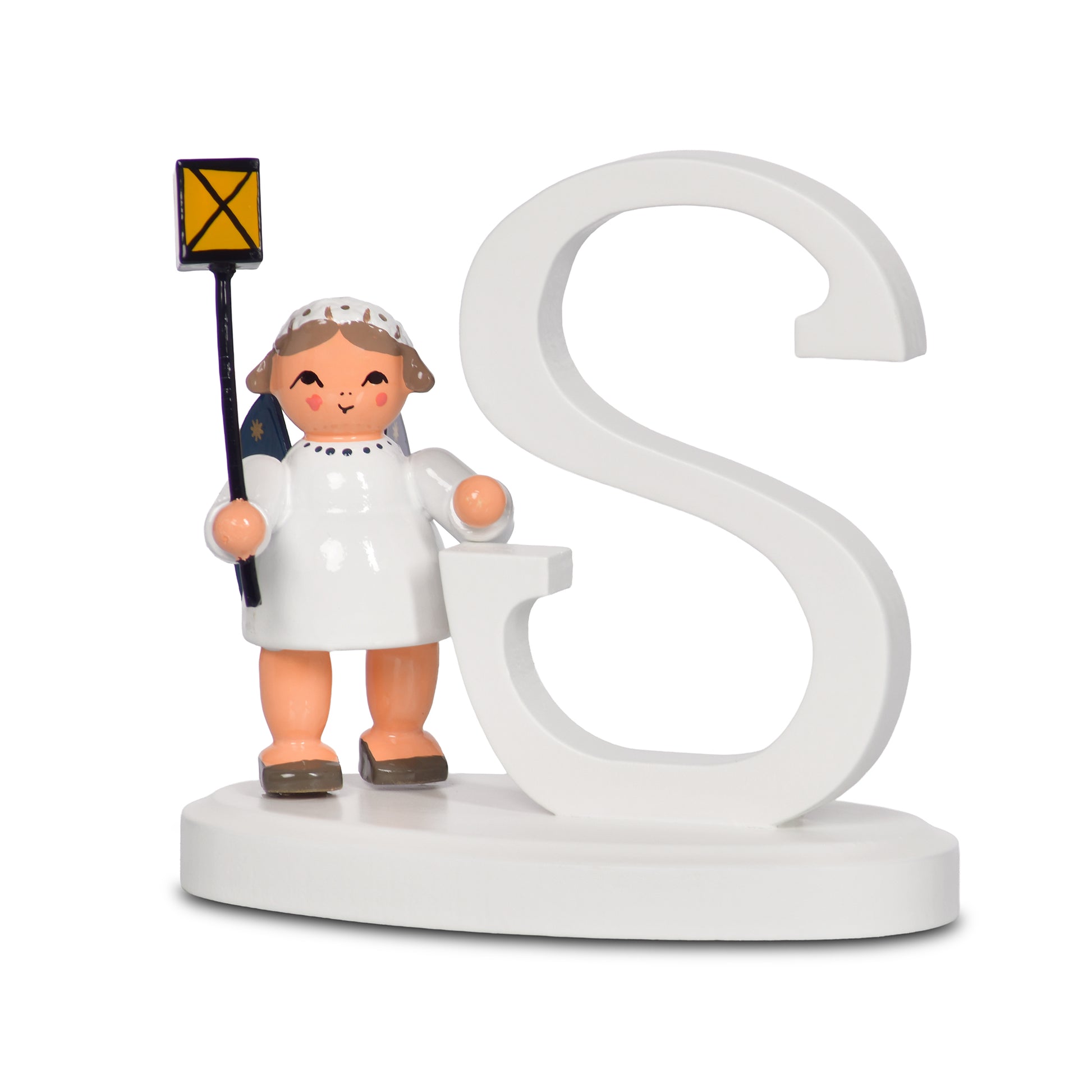 Der KWO Buchstabenengel "S" (Art. 75778) trägt ein weißes Gewand, die Flügel sind dunkelblau und mit 5 goldenen Sternchen bemalt. Der Buchstabenengel "S" wird in traditioneller Handwerkskunst im Erzgebirge mit viel Liebe zum Detail von Hand gefertigt.