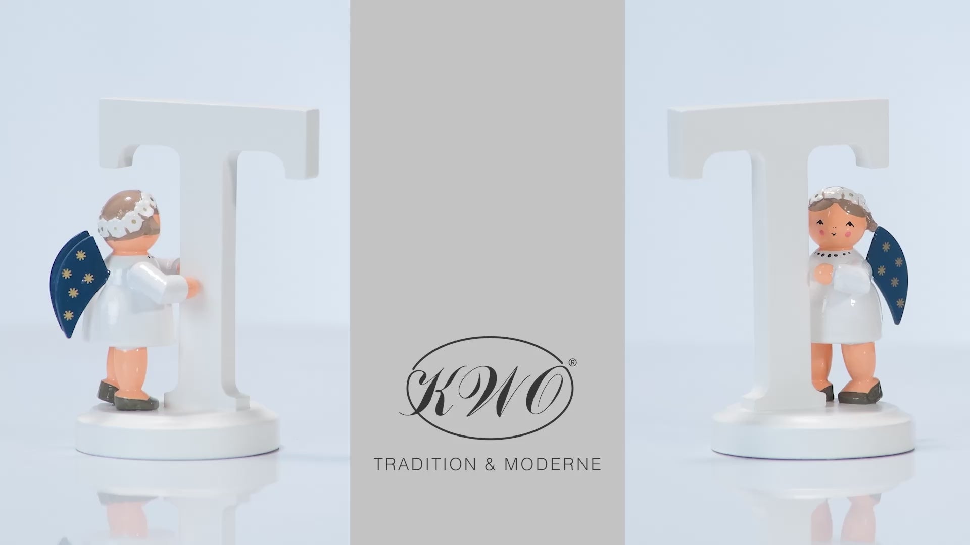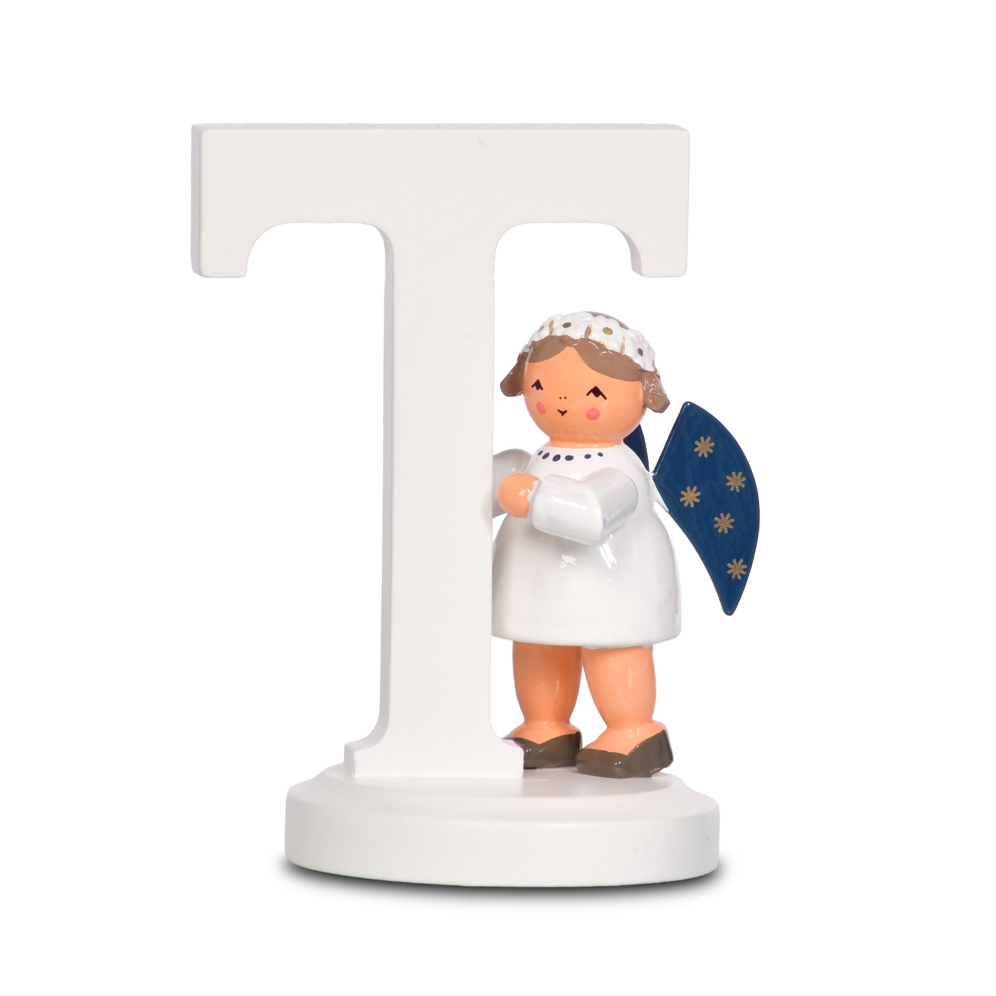 Der KWO Buchstabenengel "T" (Art. 75779) trägt ein weißes Gewand, die Flügel sind dunkelblau und mit 5 goldenen Sternchen bemalt. Der Buchstabenengel "T" wird in traditioneller Handwerkskunst im Erzgebirge mit viel Liebe zum Detail von Hand gefertigt.