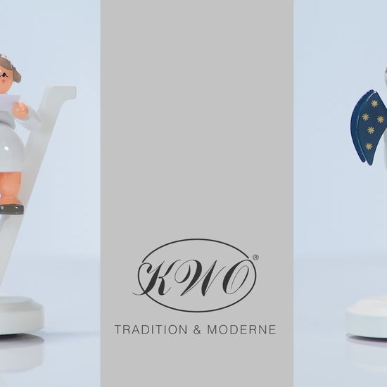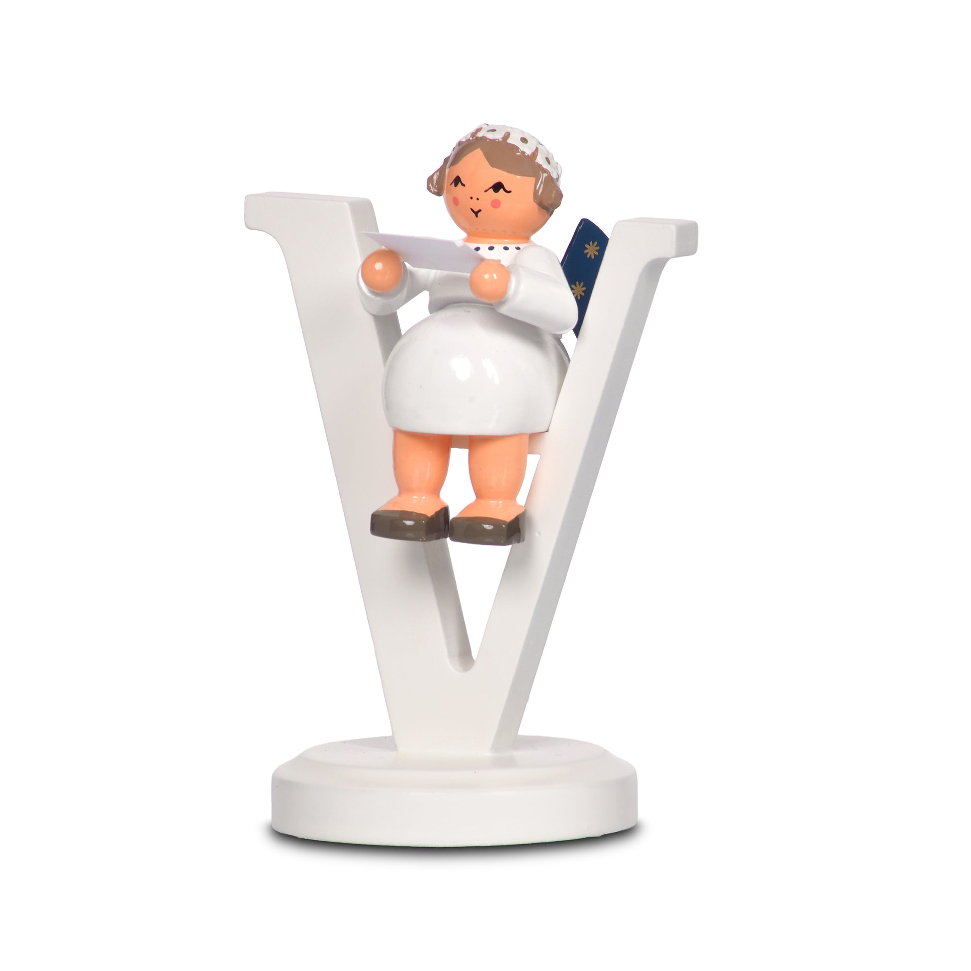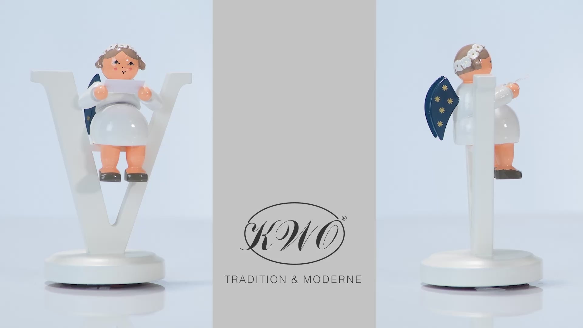 Der KWO Buchstabenengel "V" (Art. 75781) trägt ein weißes Gewand, die Flügel sind dunkelblau und mit 5 goldenen Sternchen bemalt. Der Buchstabenengel "V" wird in traditioneller Handwerkskunst im Erzgebirge mit viel Liebe zum Detail von Hand gefertigt.