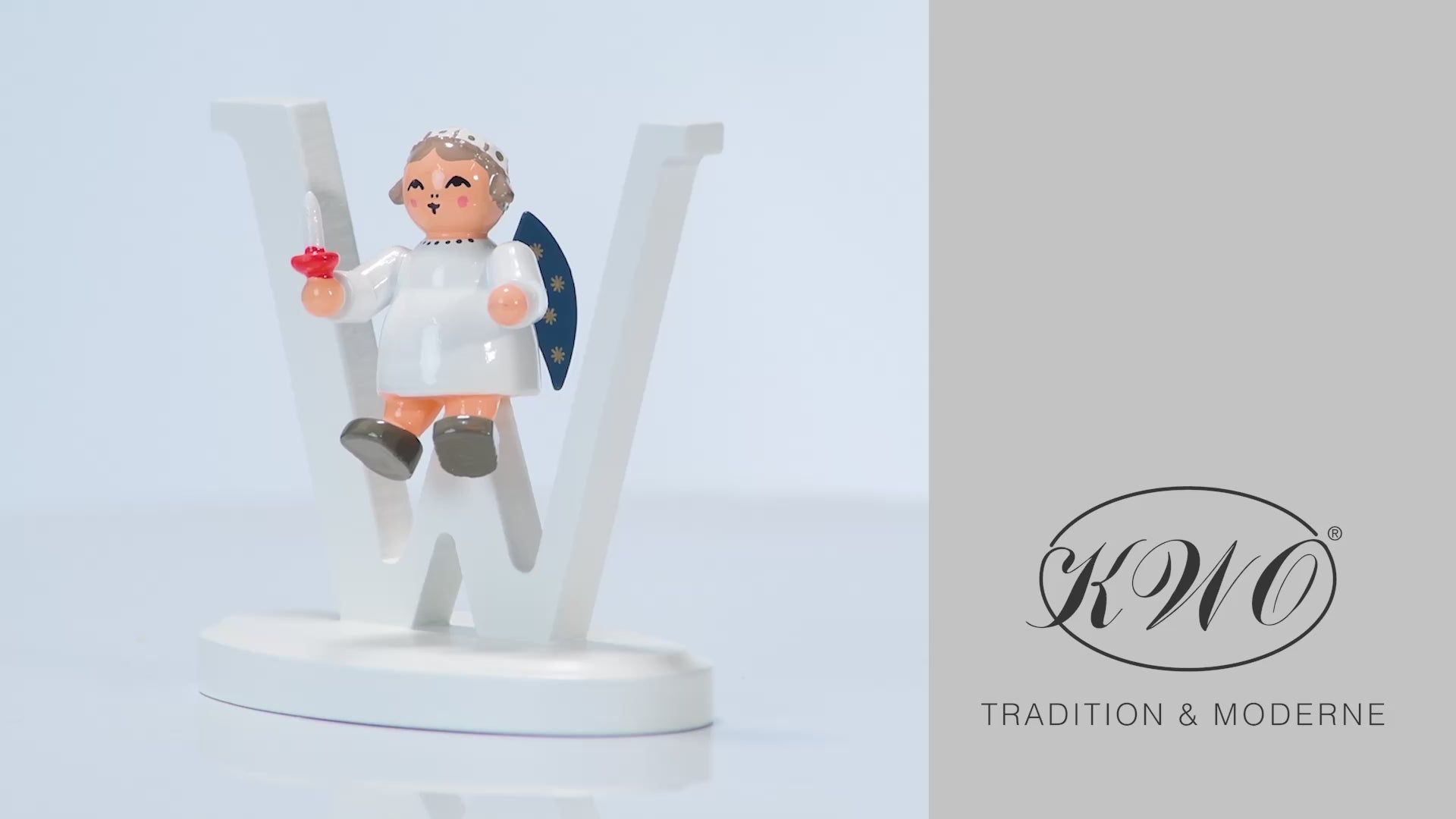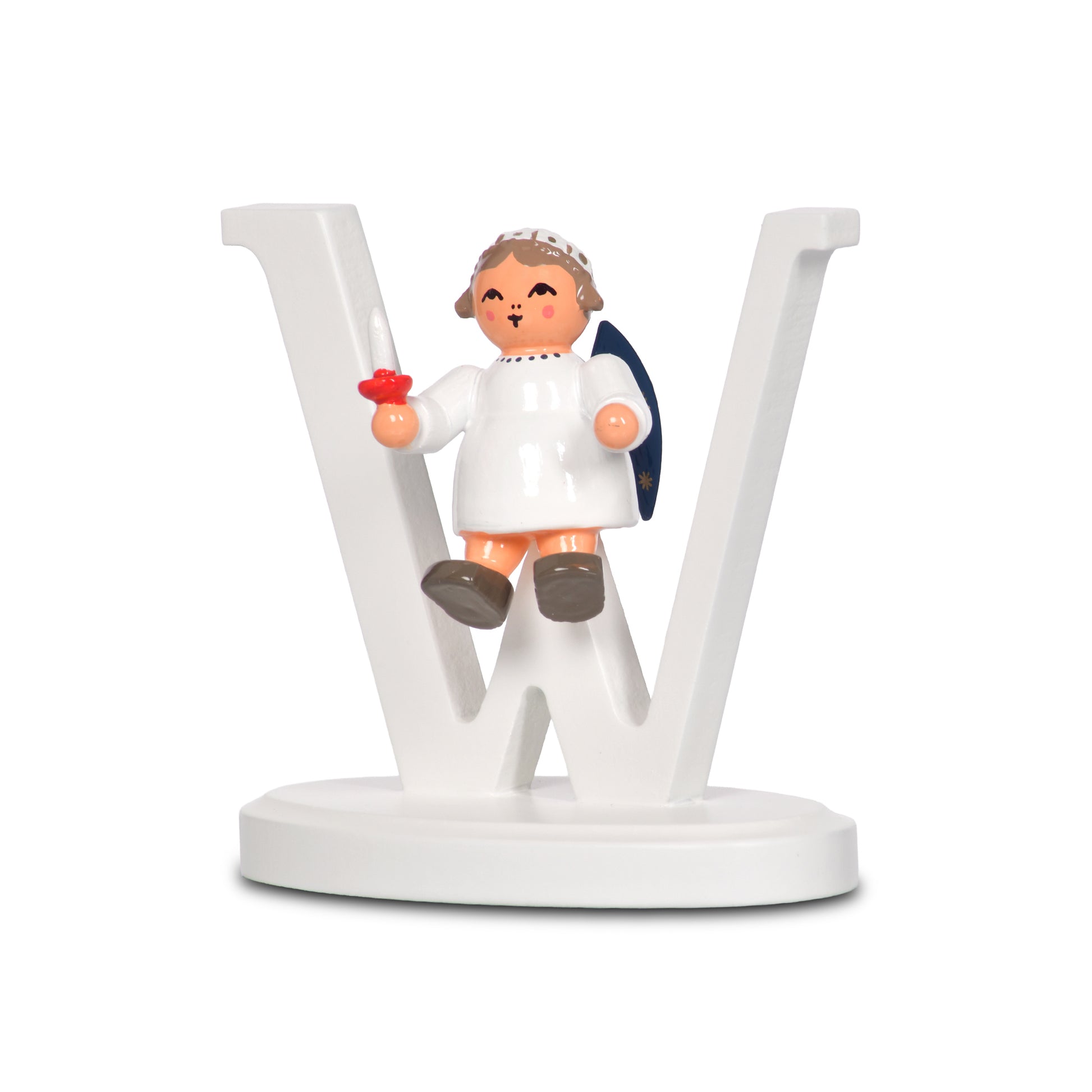 Der KWO Buchstabenengel "W" (Art. 75782) trägt ein weißes Gewand, die Flügel sind dunkelblau und mit 5 goldenen Sternchen bemalt. Der Buchstabenengel "W" wird in traditioneller Handwerkskunst im Erzgebirge mit viel Liebe zum Detail von Hand gefertigt.