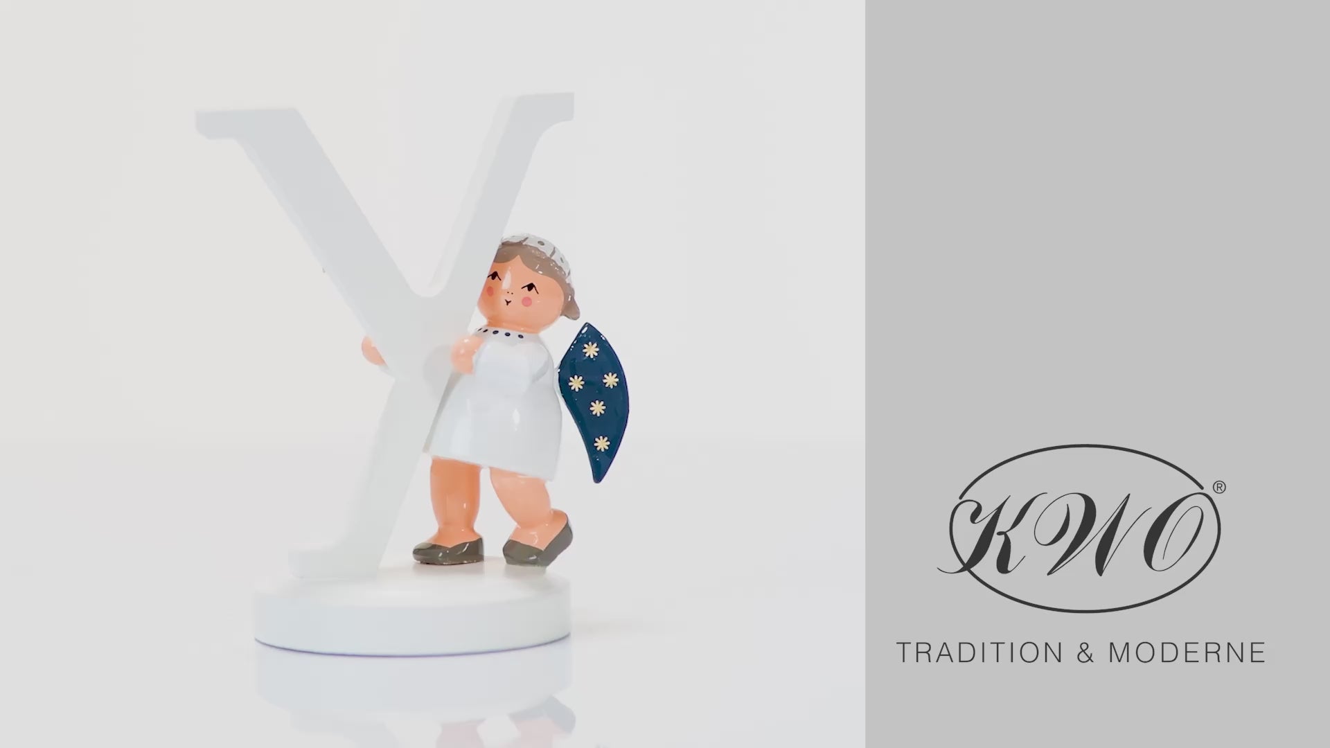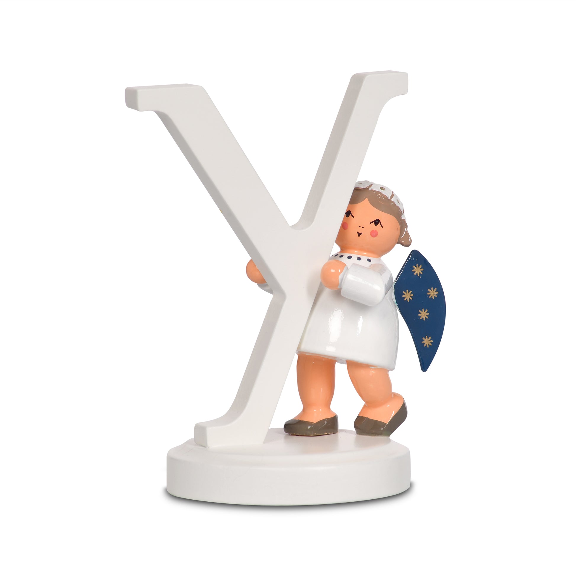 Der KWO Buchstabenengel "Y" (Art. 75784) trägt ein weißes Gewand, die Flügel sind dunkelblau und mit 5 goldenen Sternchen bemalt. Der Buchstabenengel "Y" wird in traditioneller Handwerkskunst im Erzgebirge mit viel Liebe zum Detail von Hand gefertigt.