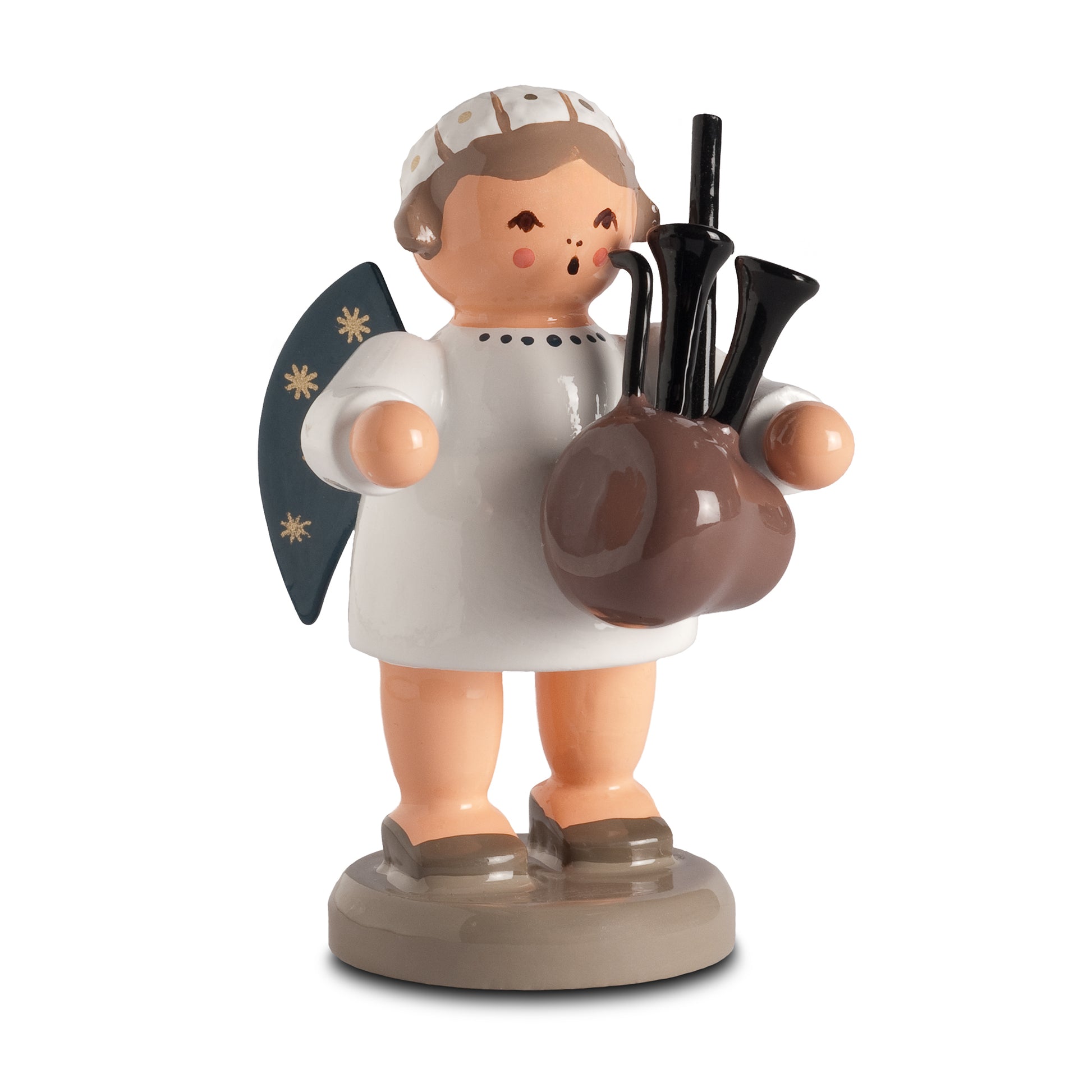 Der KWO Musikengel mit Dudelsack (Art. 75679) trägt ein weißes Gewand, die Flügel sind dunkelblau und mit 5 goldenen Sternchen bemalt. Der Musikengel mit Dudelsack wird in traditioneller Handwerkskunst im Erzgebirge mit viel Liebe zum Detail von Hand gefertigt.