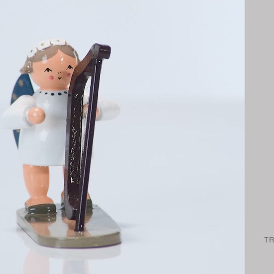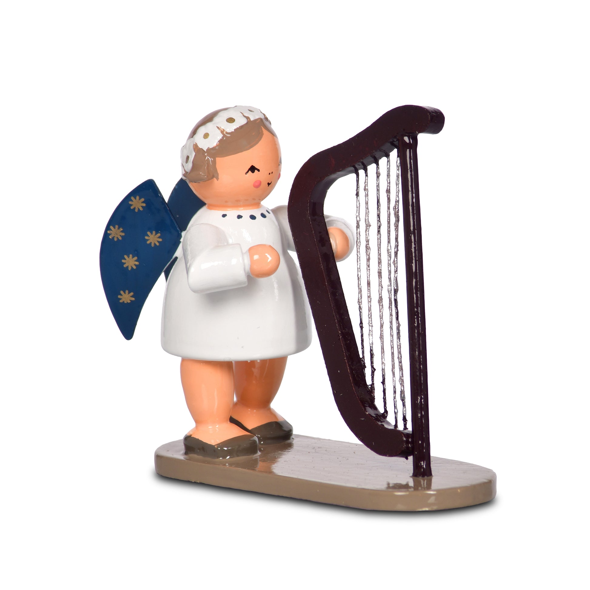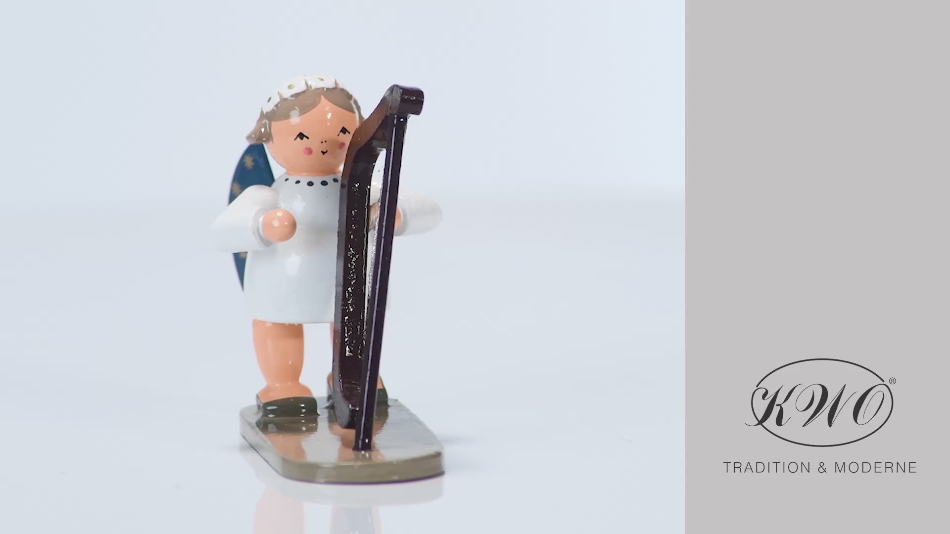 Der KWO Musikengel mit Harfe (Art. 75615) trägt ein weißes Gewand, die Flügel sind dunkelblau und mit 5 goldenen Sternchen bemalt. Der Musikengel mit Harfe wird in traditioneller Handwerkskunst im Erzgebirge mit viel Liebe zum Detail von Hand gefertigt.