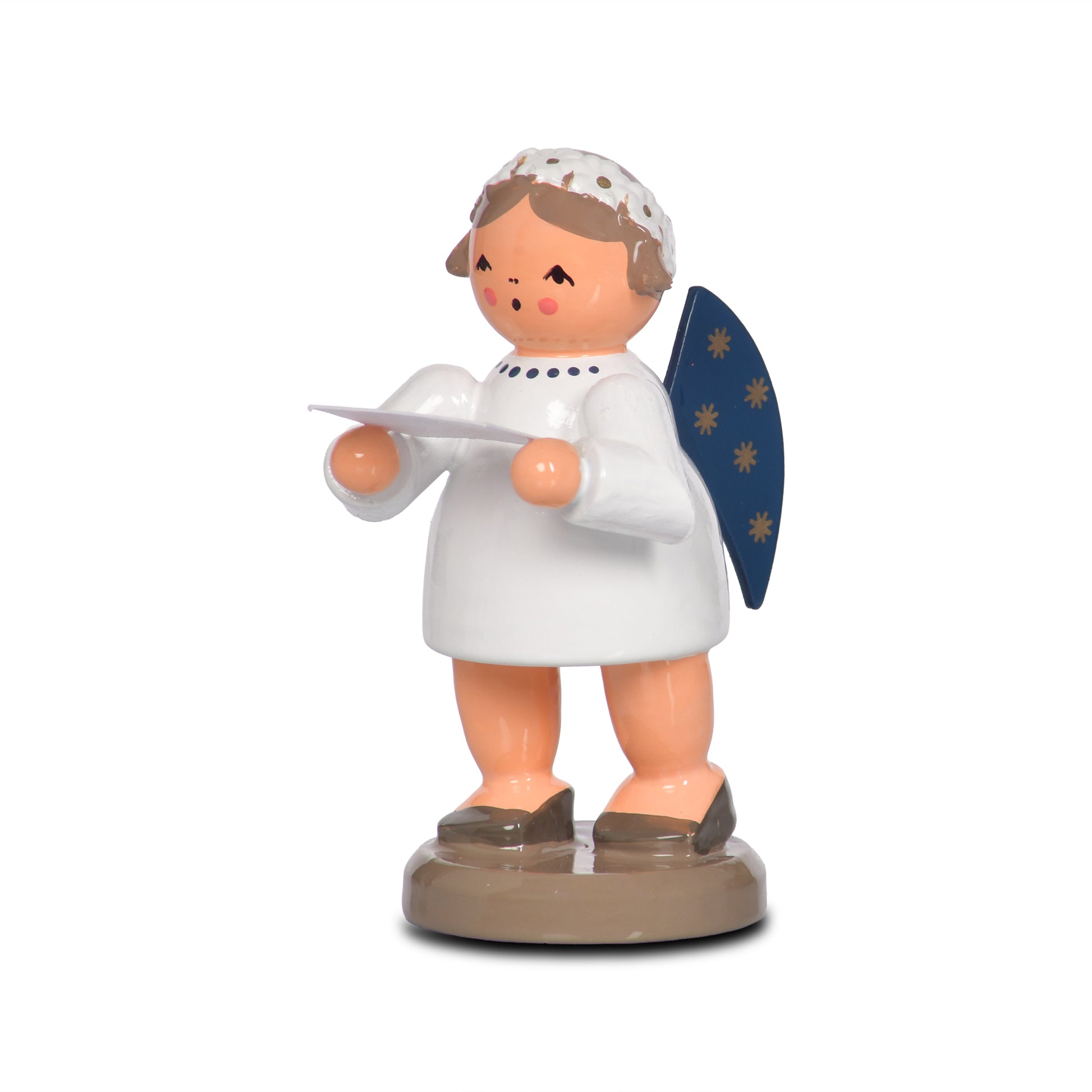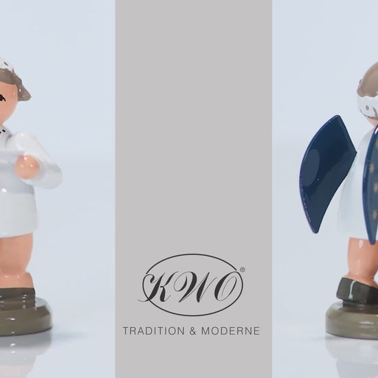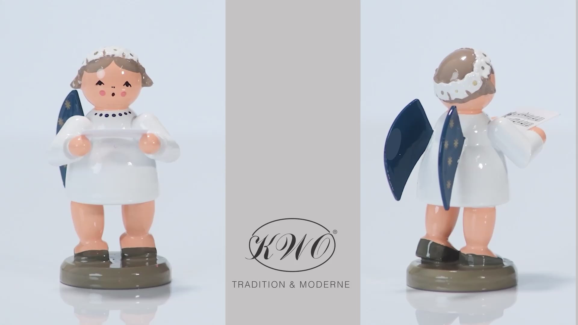 Der KWO Musikengel mit Notenblatt (Art. 75614) trägt ein weißes Gewand, die Flügel sind dunkelblau und mit 5 goldenen Sternchen bemalt. Der Musikengel mit Notenblatt wird in traditioneller Handwerkskunst im Erzgebirge mit viel Liebe zum Detail von Hand gefertigt.
