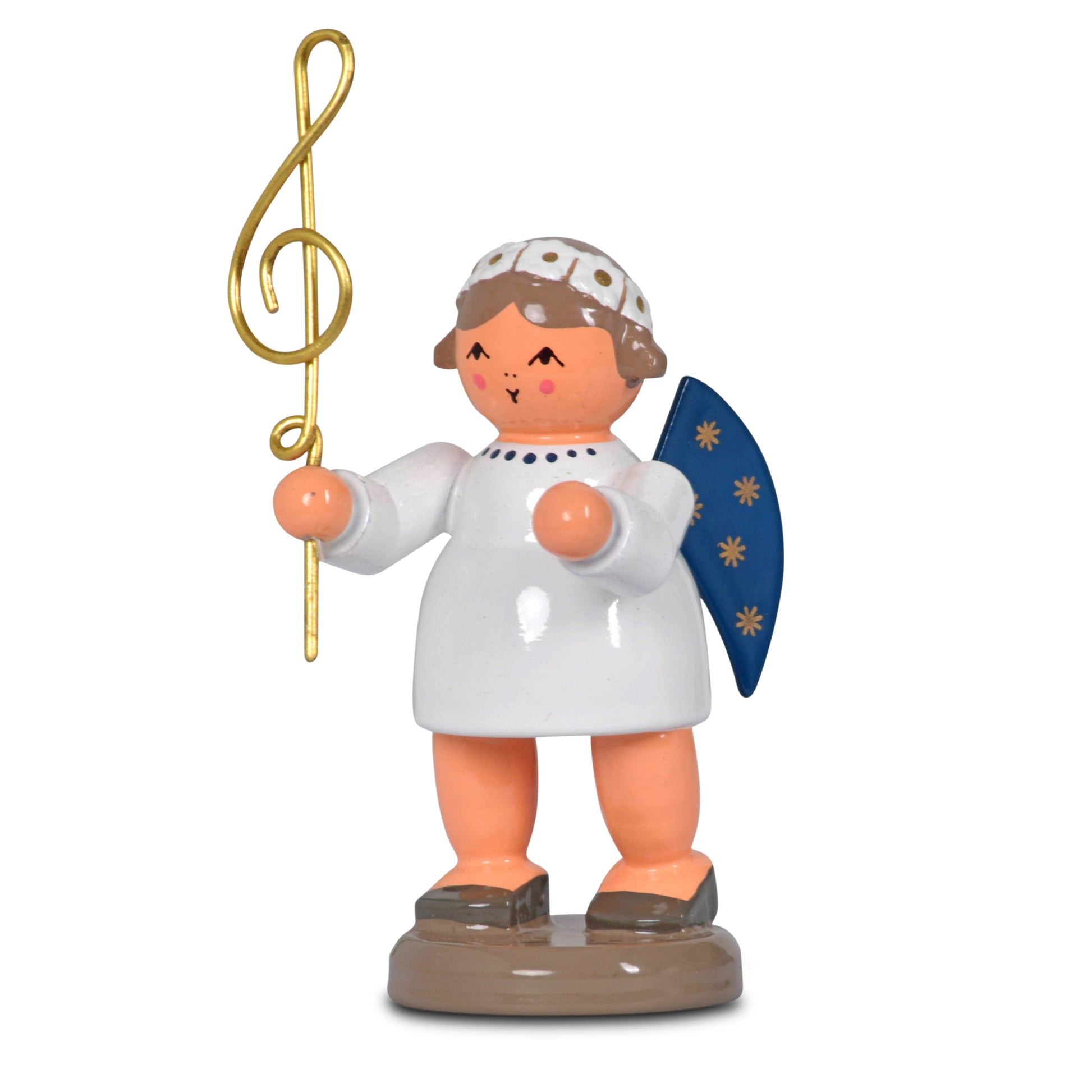 Der KWO Musikengel trägt ein weißes Gewand, die Flügel sind dunkelblau und mit 5 goldenen Sternchen bemalt. Der Musikengel mit Notenschlüssel wird in traditioneller Handwerkskunst im Erzgebirge mit viel Liebe zum Detail von Hand gefertigt.