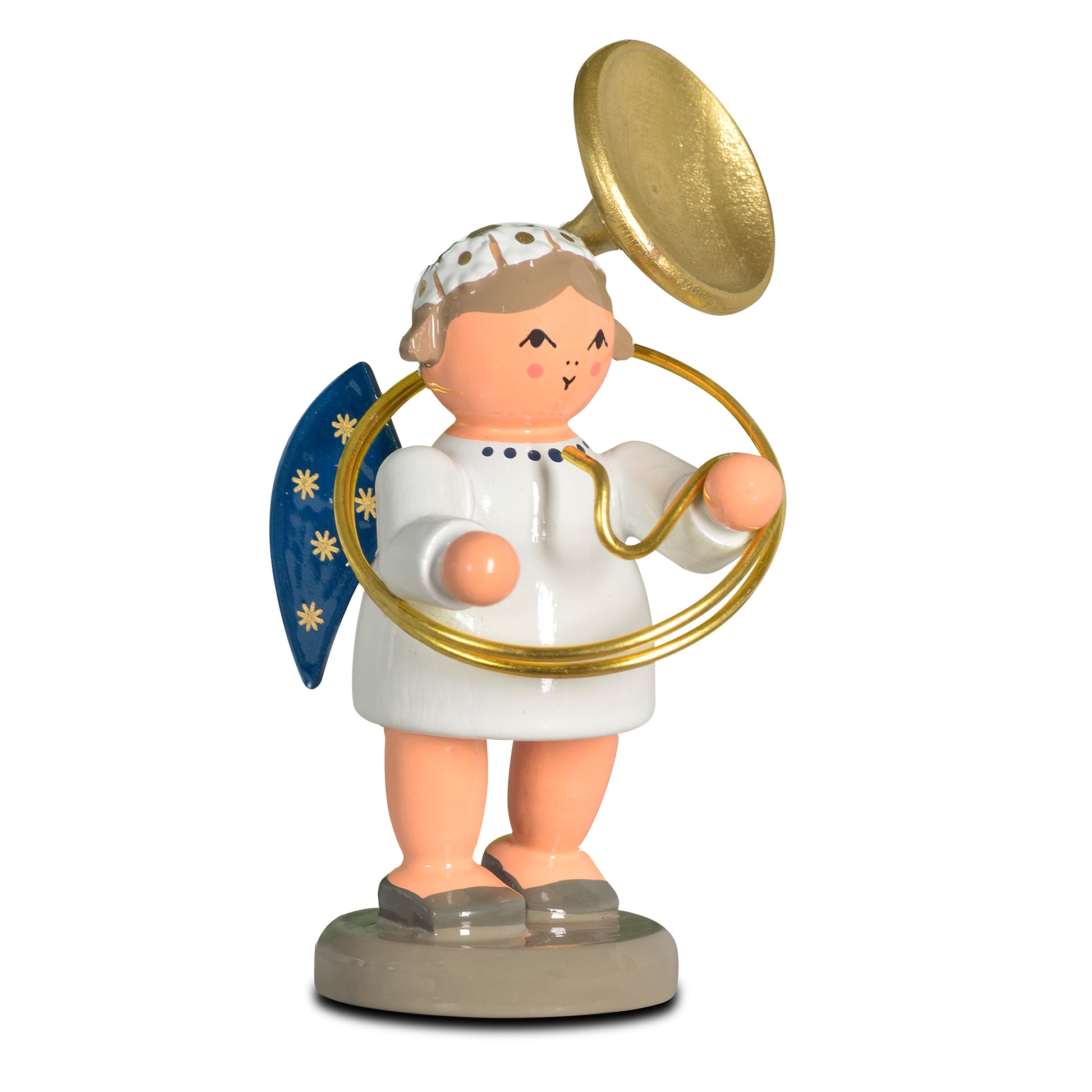 Der KWO Engel mit Sousaphon (Art. 75697) trägt ein weißes Gewand, die Flügel sind dunkelblau und mit 5 goldenen Sternchen bemalt. Der Engel mit Sousaphon wird in traditioneller Handwerkskunst im Erzgebirge mit viel Liebe zum Detail von Hand gefertigt.