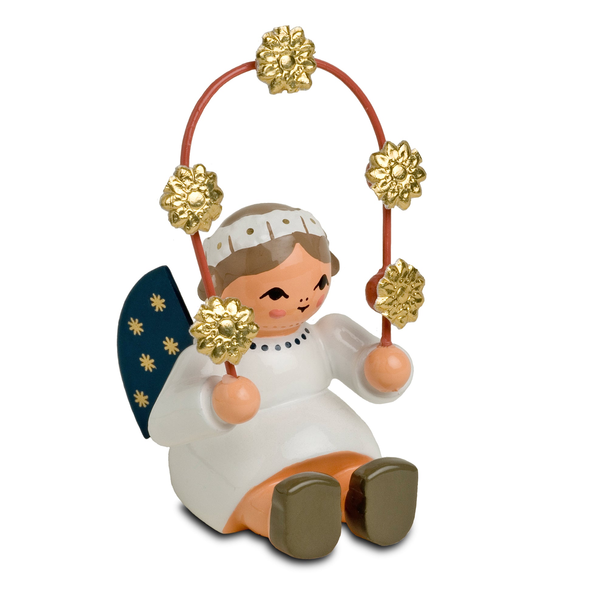 Der KWO Engel mit Sternenbogen (Art. 75675) trägt ein weißes Gewand, die Flügel sind dunkelblau und mit 5 goldenen Sternchen bemalt. Der Engel mit Sternenbogen wird in traditioneller Handwerkskunst im Erzgebirge mit viel Liebe zum Detail von Hand gefertigt.