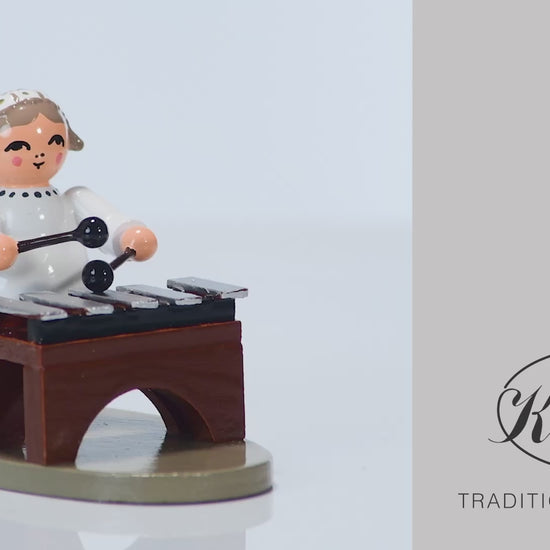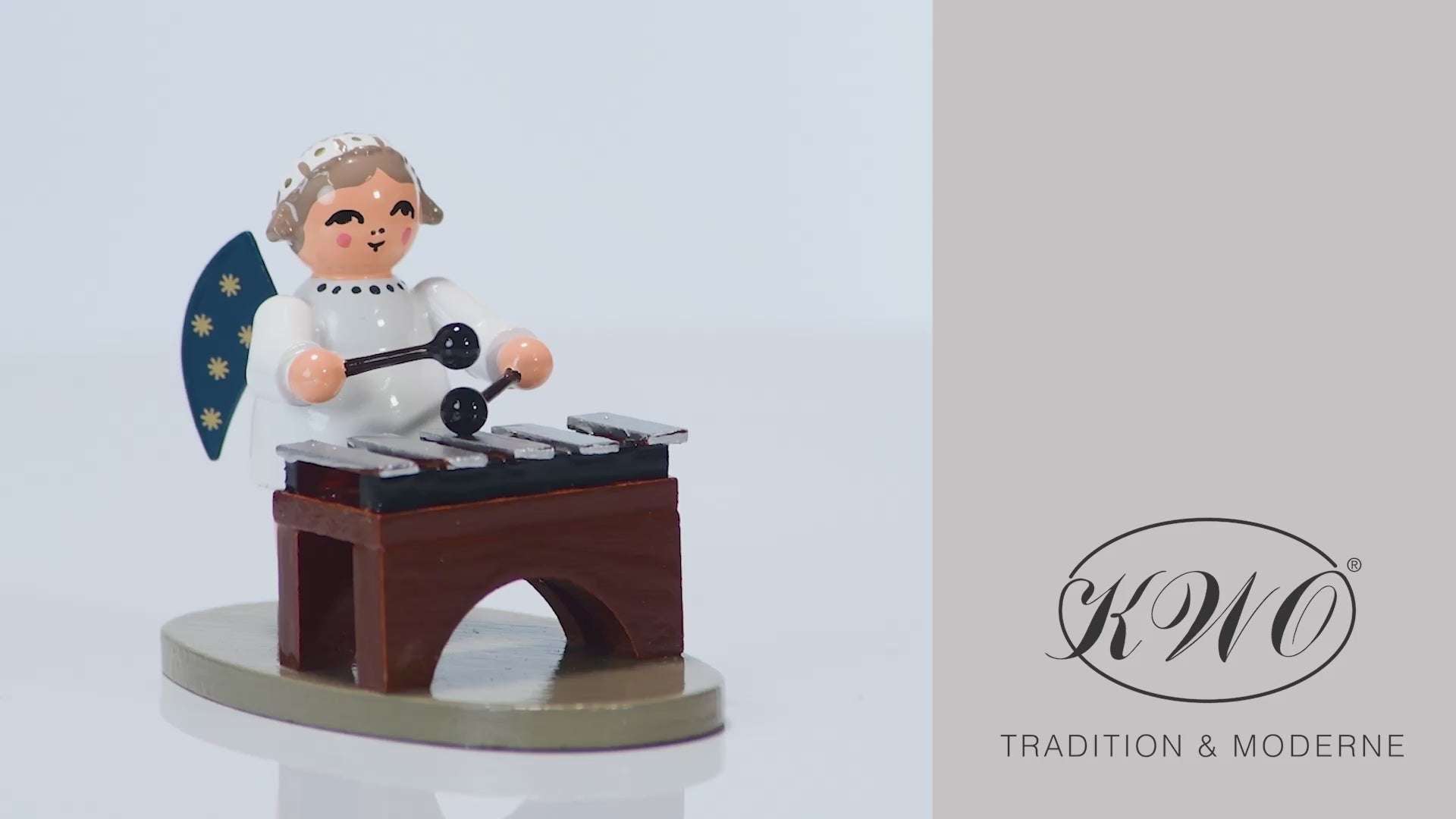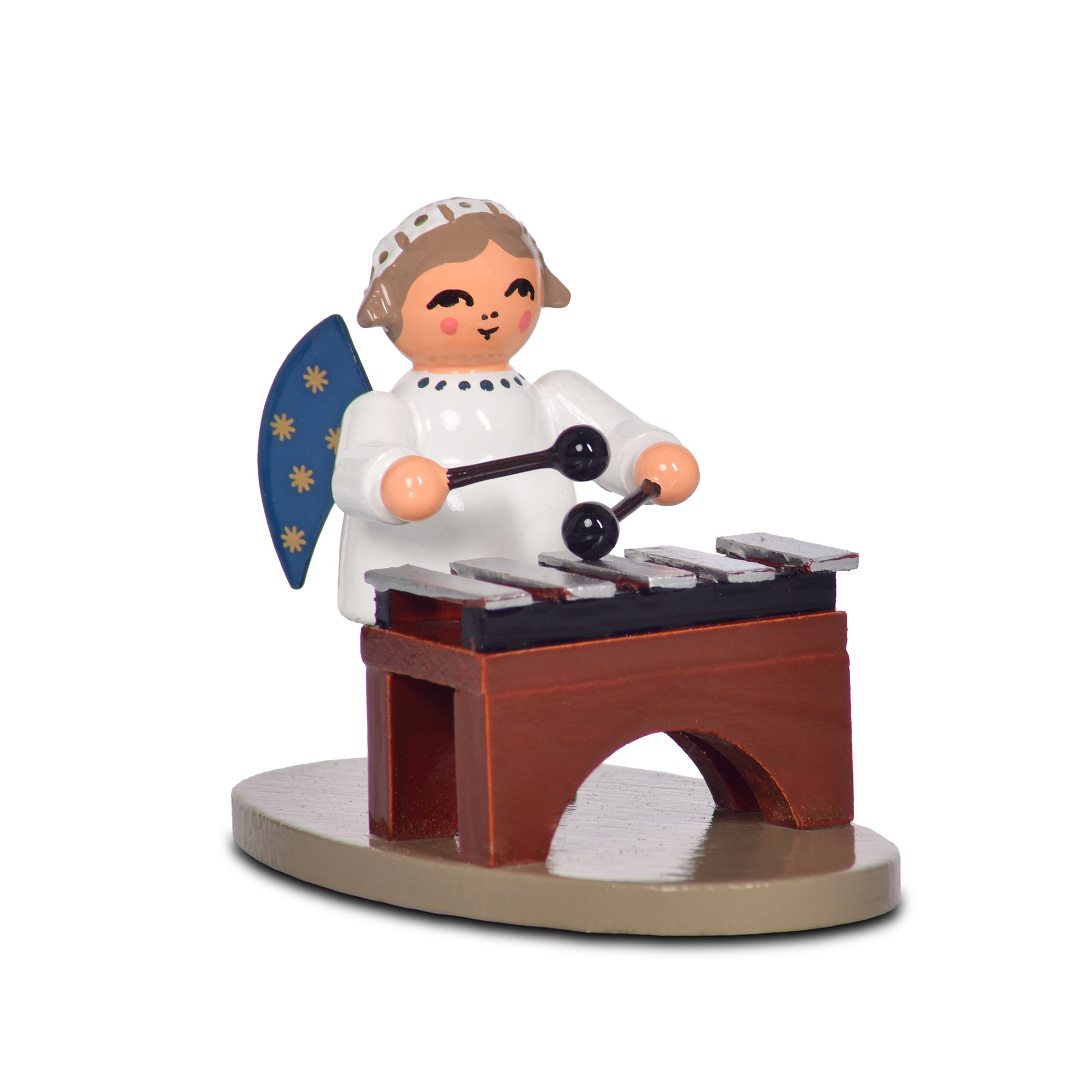 Der KWO Musikengel mit Xylophon (Art. 75642) trägt ein weißes Gewand, die Flügel sind dunkelblau und mit 5 goldenen Sternchen bemalt. Der Musikengel mit Xylophon wird in traditioneller Handwerkskunst im Erzgebirge mit viel Liebe zum Detail von Hand gefertigt.