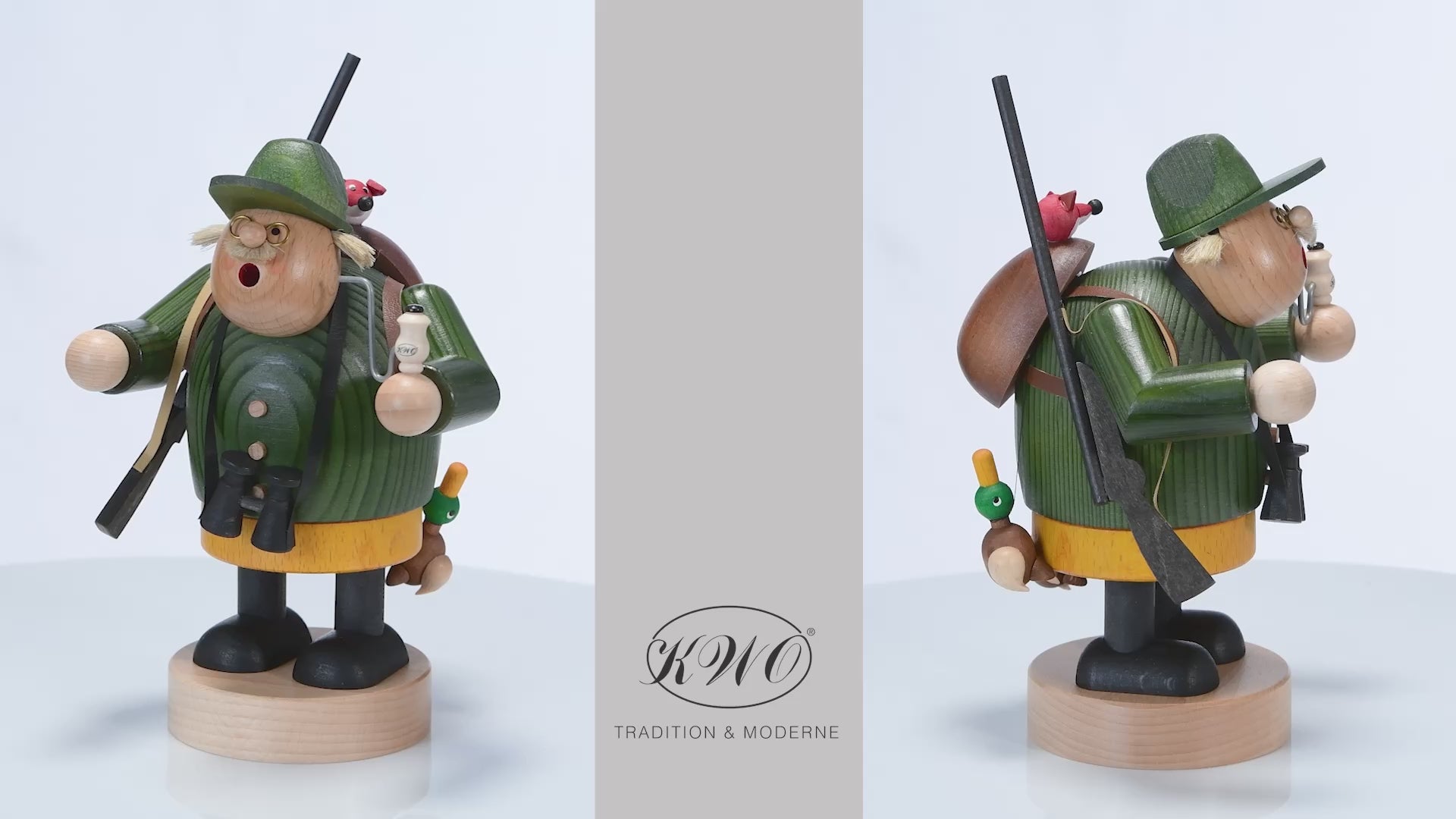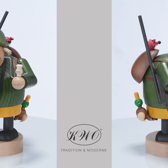 Der Räuchermann "Jäger" (Art. 21515) von KWO ist aus der Serie "Die Dicken" und wird in traditioneller Handwerkskunst im Erzgebirge mit viel Liebe zum Detail von Hand gefertigt. Unser Räuchermann "Jäger" von KWO ist gebeizt. Mit seiner Flinte geht er auf Entenjagd.