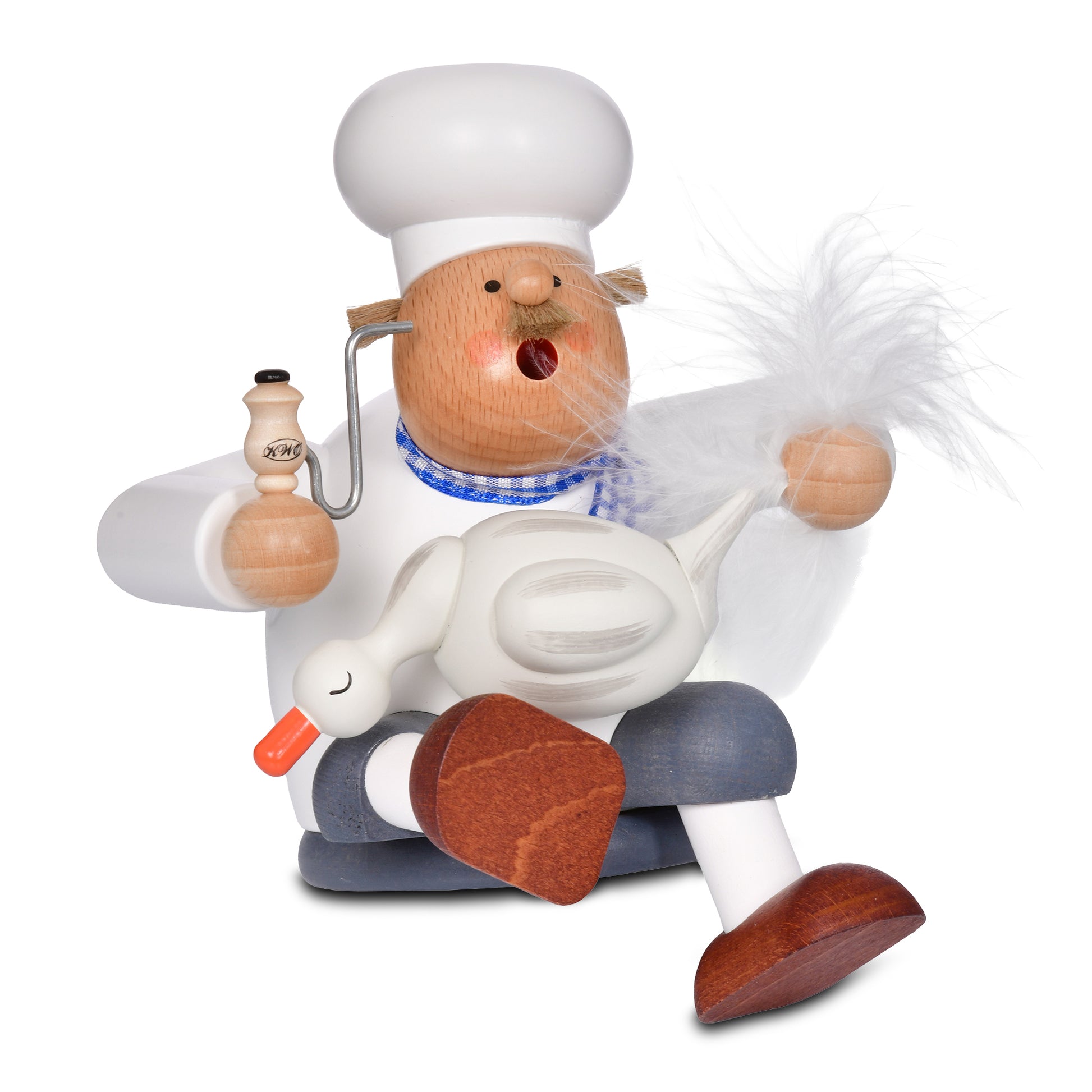 Der Räuchermann "Koch mit Gans" (Art. 21590) von KWO ist aus der Serie "Die Dicken" und wird in traditioneller Handwerkskunst im Erzgebirge mit viel Liebe zum Detail von Hand gefertigt. Unser Räuchermann "Koch mit Gans" von KWO ist weiß lackiert. Auf seinem Schoss rupft er die Weihnachtsgans.