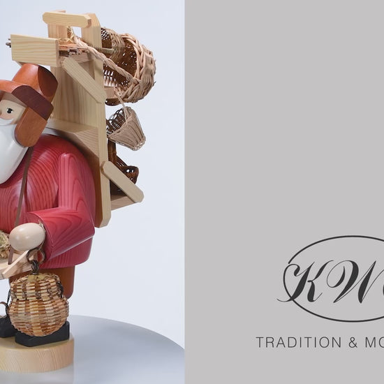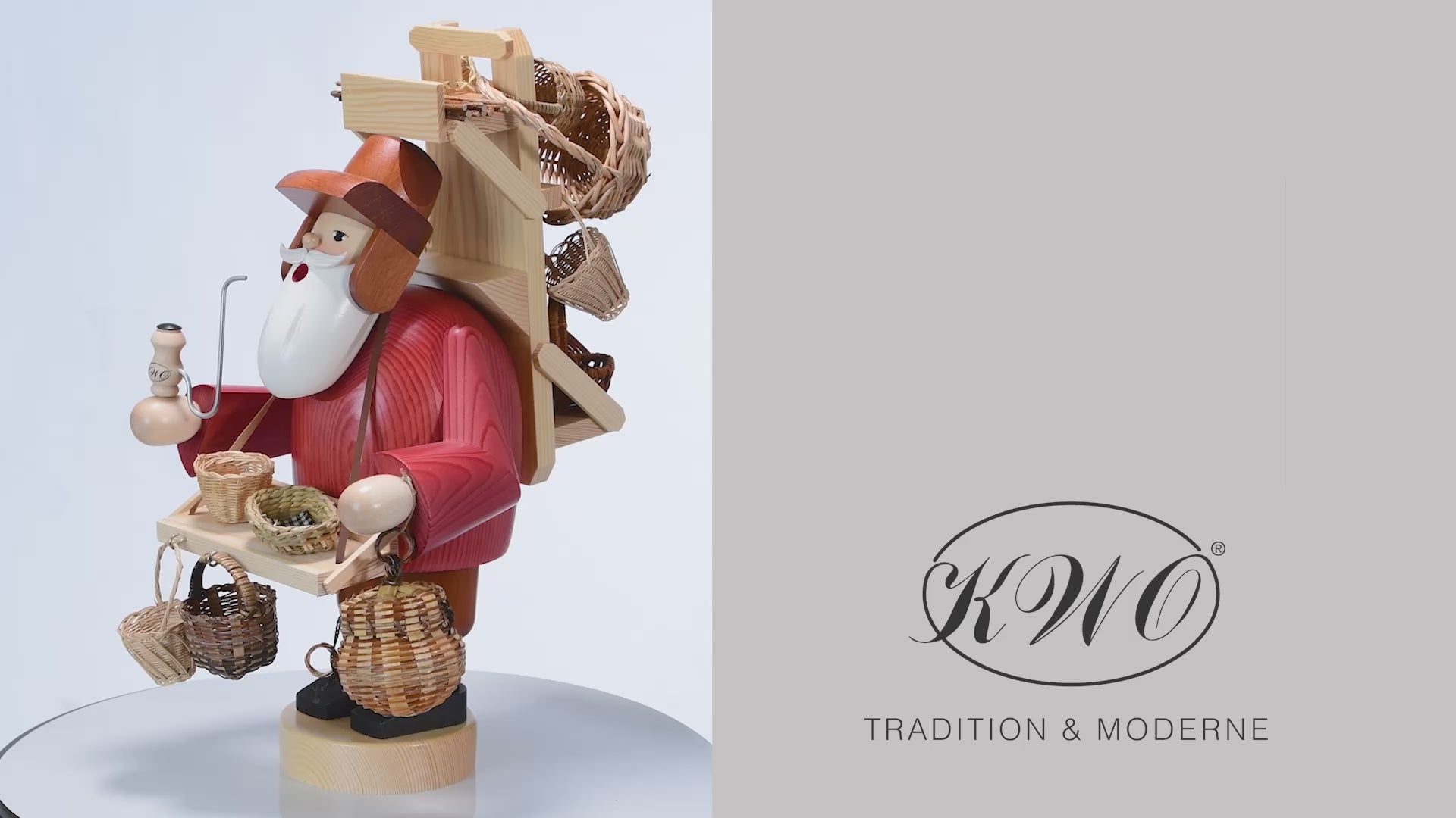 Der Räuchermann "Korbhändler" (Art. 21269) von KWO ist aus der Serie "Die Bärtigen" und wird in traditioneller Handwerkskunst im Erzgebirge mit Liebe zum Detail von Hand gefertigt. Unser "Korbhändler" ist gebeizt und er präsentiert in seinem Bauchladen viele kleine, geflochtene Körbe. Er trägt auf seinem Rücken eine Kiepe, in der noch viele Körbe Platz finden.