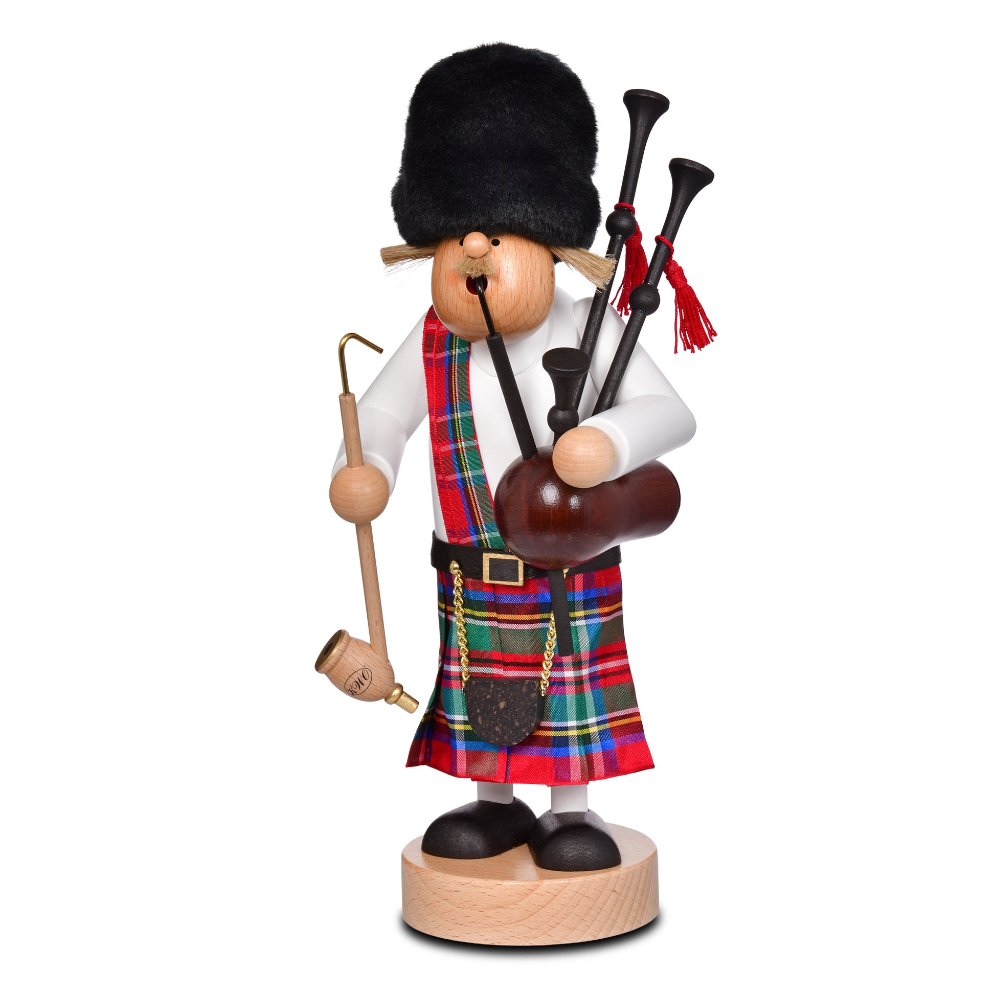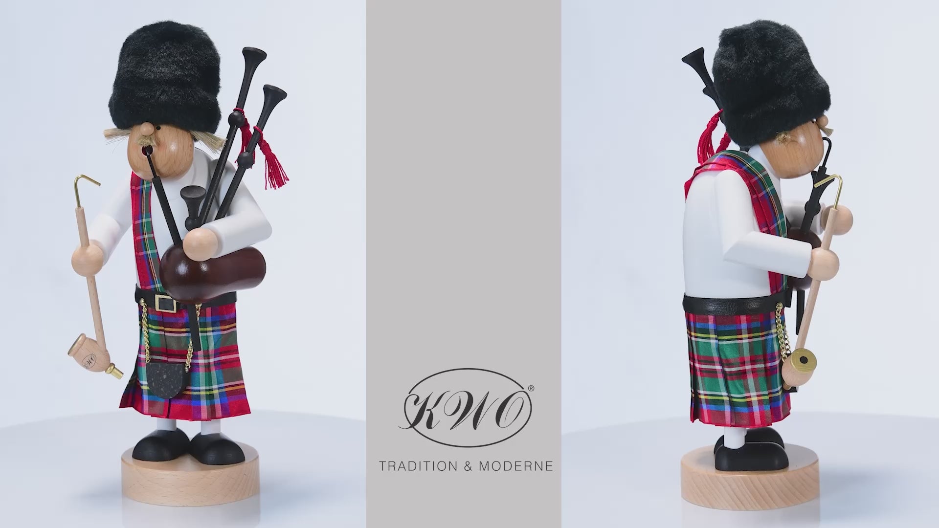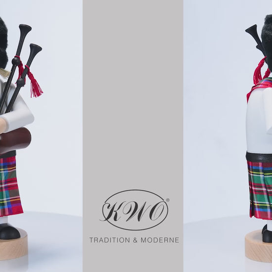 Der Räuchermann "Schotte" (Art. 21707) von KWO ist aus der Serie "Die Dünnen" und wird in traditioneller Handwerkskunst im Erzgebirge mit viel Liebe zum Detail von Hand gefertigt. Er spielt den Dudelsack.