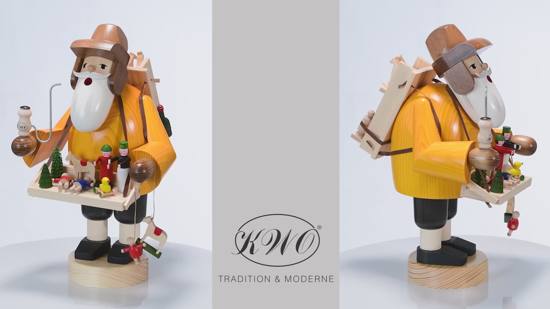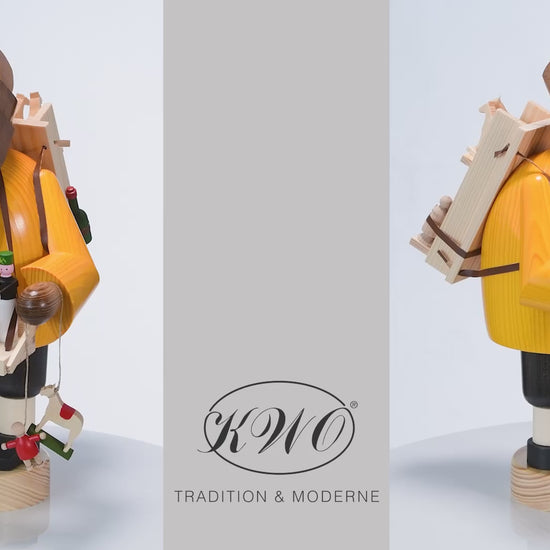 Der Räuchermann "Spielzeughändler" (Art. 21220) von KWO ist aus der Serie "Die Bärtigen" und wird in traditioneller Handwerkskunst im Erzgebirge mit Liebe zum Detail von Hand gefertigt. Unser "Spielzeughändler" ist gebeizt und er präsentiert in seinem Bauchladen viele kleine Details, die alle von Hand bemalt sind. Er trägt auf seinem Rücken eine Kiepe, mit der er viele schöne Spielsachen transportiert. An seiner linken Hand hängen ein Pferd und ein Püppchen.