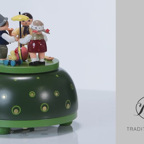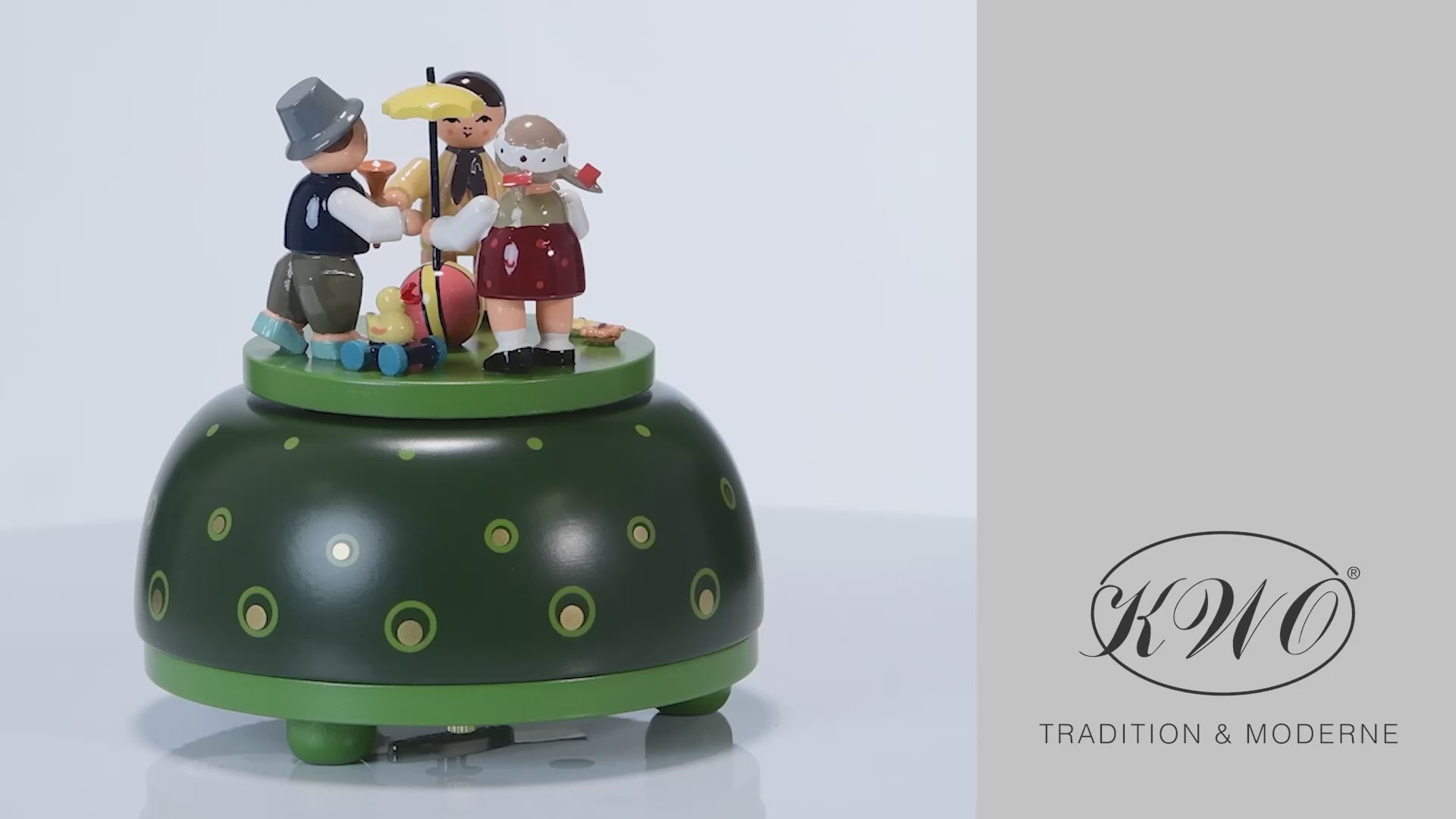Die KWO Spieldose Kinderreigen (Art. 13003) ist 11,5 cm hoch. Mit großem Aufwand werden alle Bauteile manuell hergestellt. Jede Dose wird von Hand bemalt und stellt für sich ein kleines Unikat dar. Die KWO Spieldose Kinderreigen ist mit einem mechanischen, 18er Spielwerk von Sanyo versehen und spielt die Melodie: "Hopp, hopp, hopp"… Das Spielwerk wird von unten aufgezogen und abgestellt. Als Spielwerk kommen nur Modelle zum Einsatz, welche unseren hohen Qualitätsanforderungen genügen.