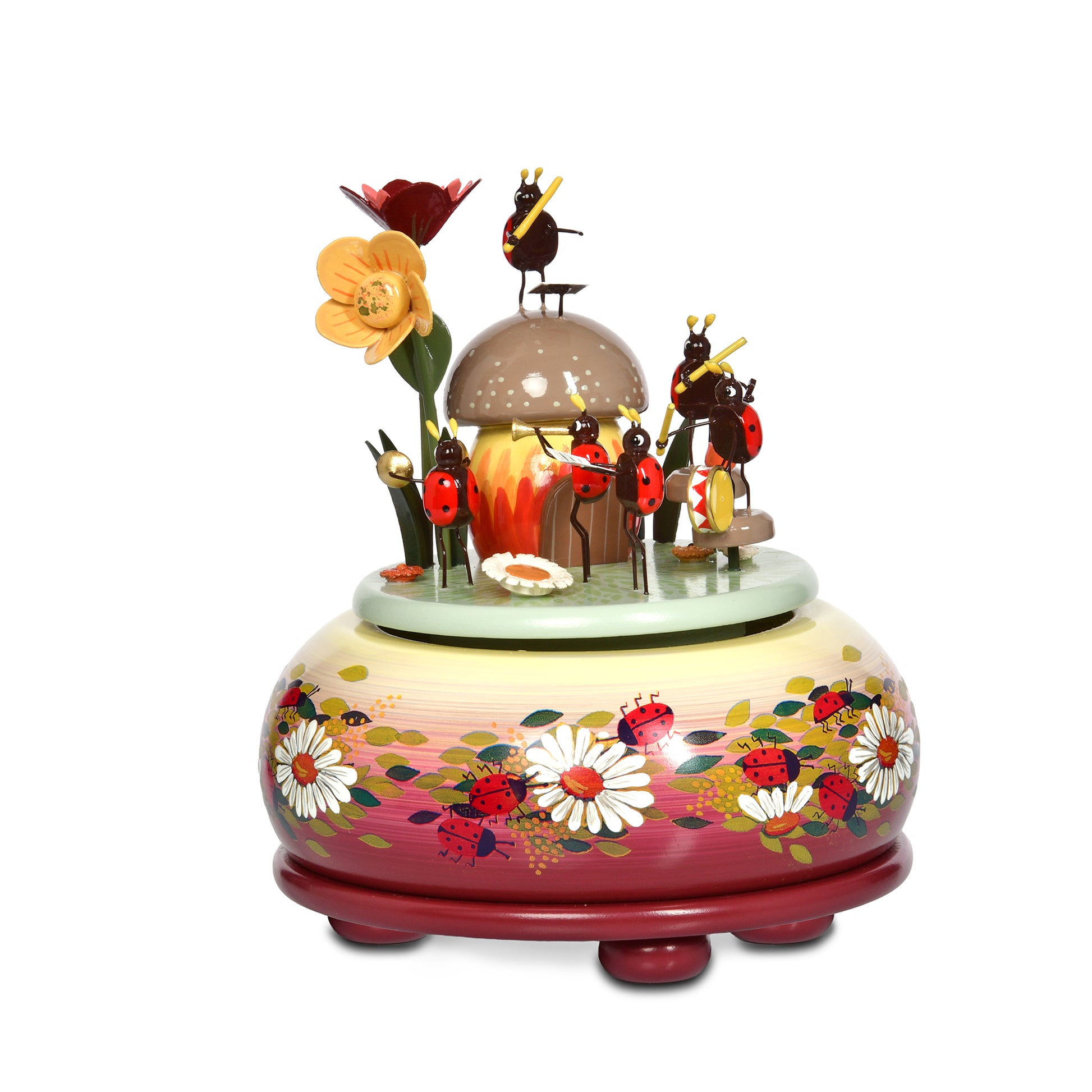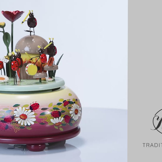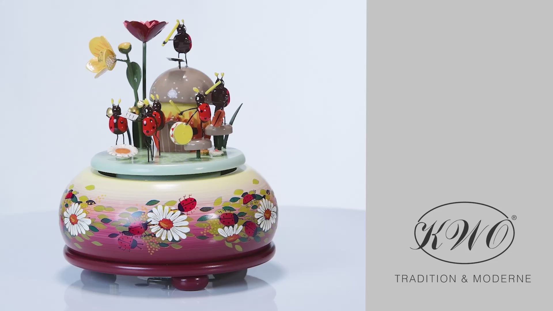 Die KWO Spieldose musizierende Käfer (Art. 13017) ist 14 cm hoch. Mit großem Aufwand werden alle Bauteile manuell hergestellt. Jede Dose wird von Hand bemalt und stellt für sich ein kleines Unikat dar. Die KWO Spieldose musizierende Käfer ist mit einem mechanischen, 18er Spielwerk von Sankyo versehen und spielt die Melodie: "Der fröhliche Wanderer"… Das Spielwerk wird von unten aufgezogen und abgestellt. Als Spielwerk kommen nur Modelle zum Einsatz, welche unseren hohen Qualitätsanforderungen genügen.