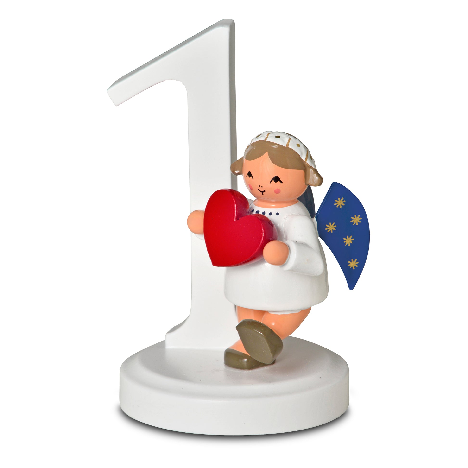 Der KWO Zahlenengel "1" (Art. 75791) trägt ein weißes Gewand, die Flügel sind dunkelblau und mit 5 goldenen Sternchen bemalt. Der Zahlenengel "1" wird in traditioneller Handwerkskunst im Erzgebirge mit viel Liebe zum Detail von Hand gefertigt.