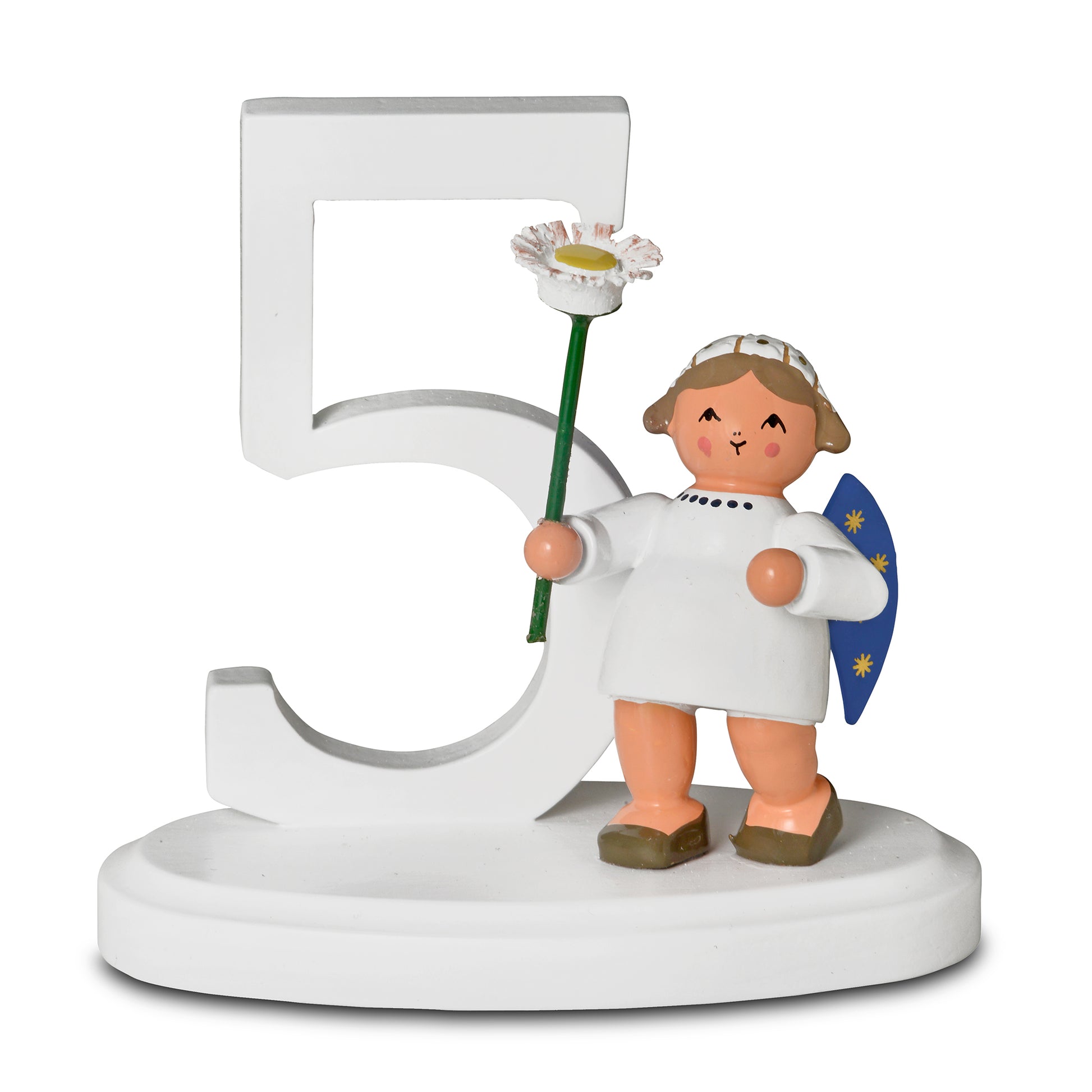 Der KWO Zahlenengel "5" (Art. 75795) trägt ein weißes Gewand, die Flügel sind dunkelblau und mit 5 goldenen Sternchen bemalt. Der Zahlenengel "5" wird in traditioneller Handwerkskunst im Erzgebirge mit viel Liebe zum Detail von Hand gefertigt.