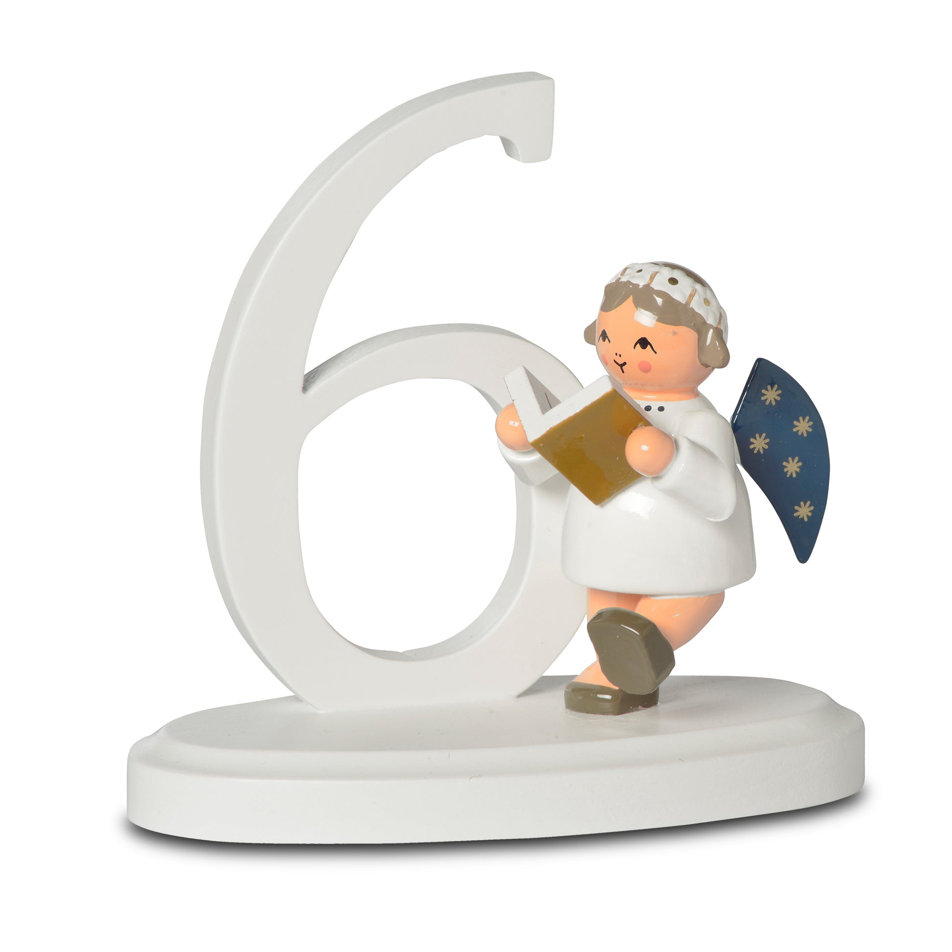 Der KWO Zahlenengel "6" (Art. 75796) trägt ein weißes Gewand, die Flügel sind dunkelblau und mit 5 goldenen Sternchen bemalt. Der Zahlenengel "6" wird in traditioneller Handwerkskunst im Erzgebirge mit viel Liebe zum Detail von Hand gefertigt.